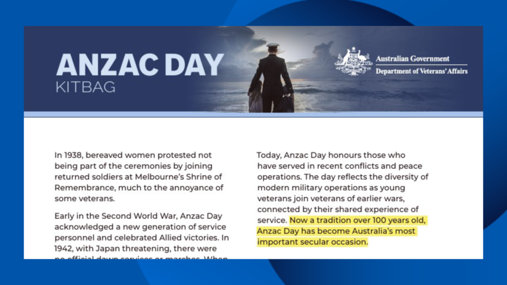 A flyer about the history of Anzac Day, developed by DVA and made available for public use through its online Anzac Portal, includes the claim about the day being Australia’s most important secular occasion (see the screenshot below).